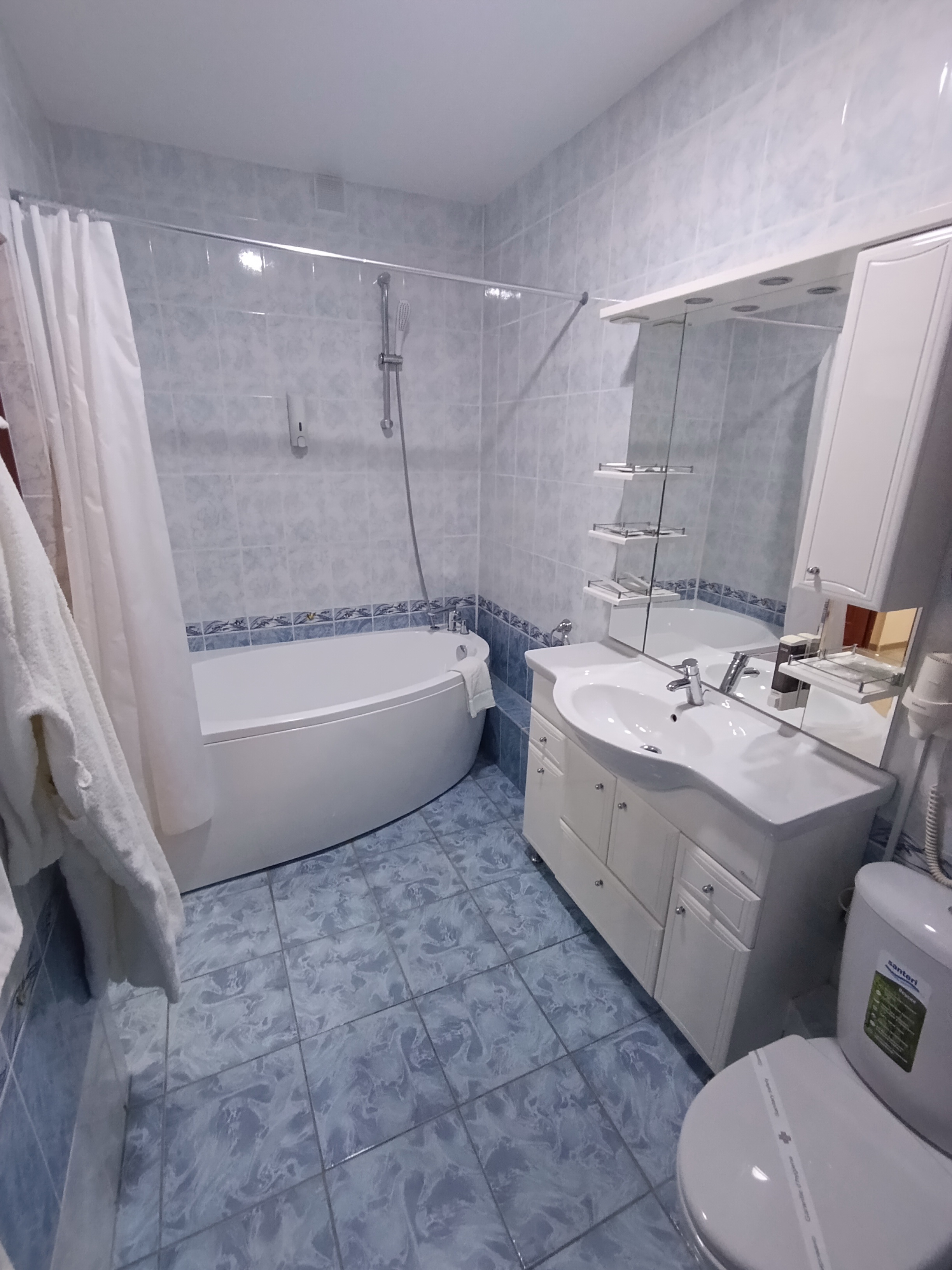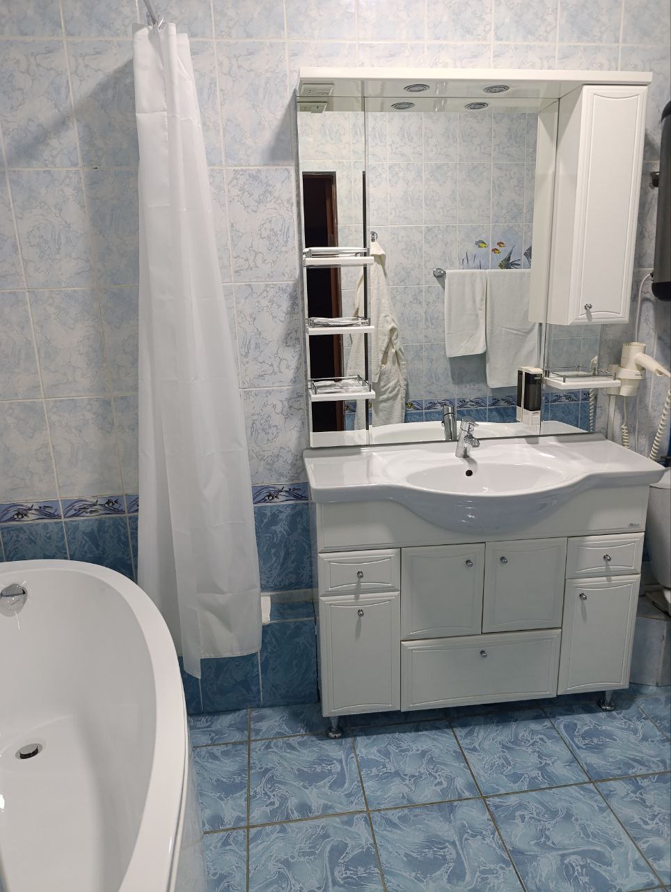В ванной комнате находятся ванна, фен, средства индивидуальной гигиены, халат, тапочки, комплект полотенец. Полотенца меняются ежедневно, постельное белье – один раз в три дня.