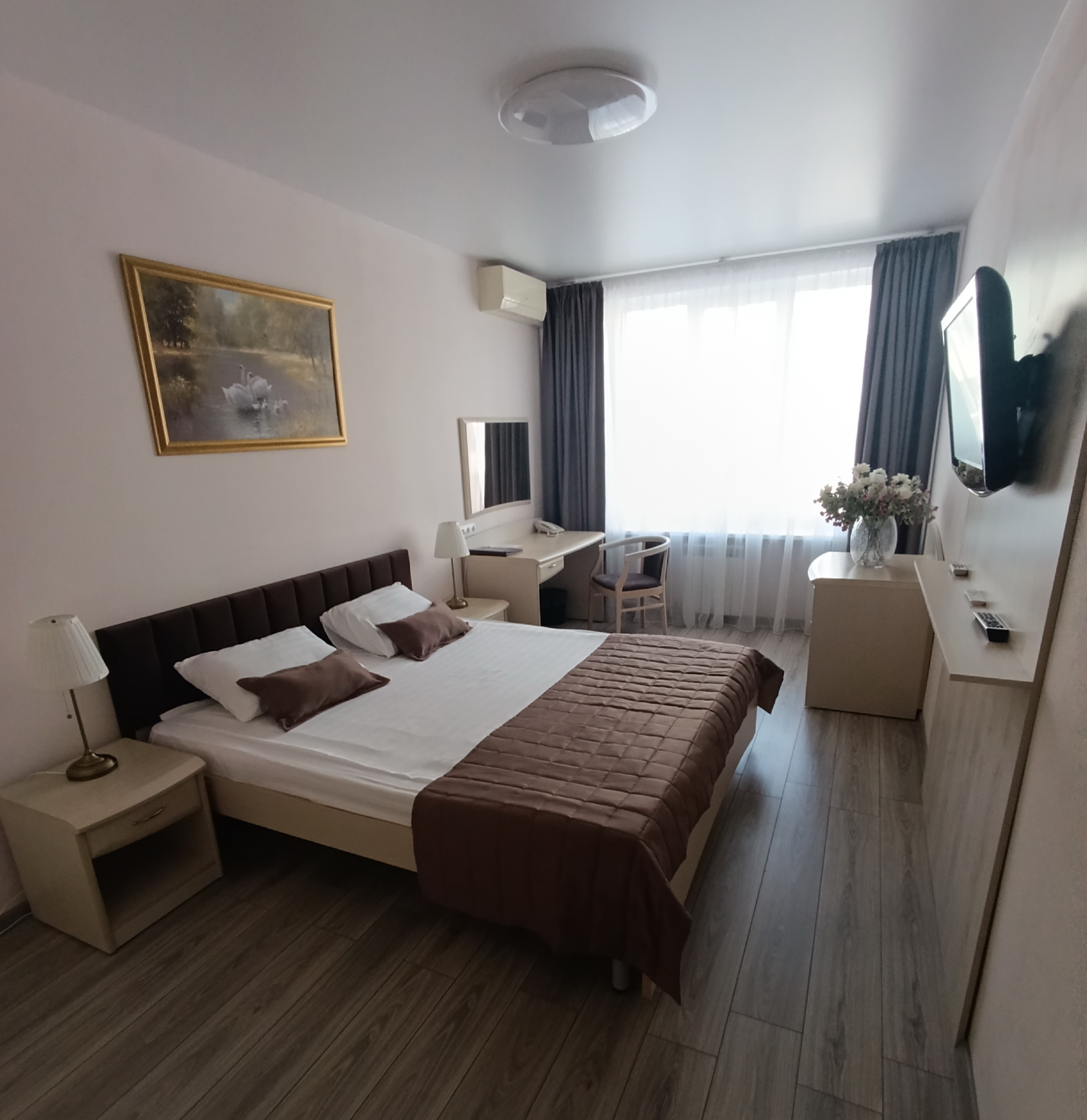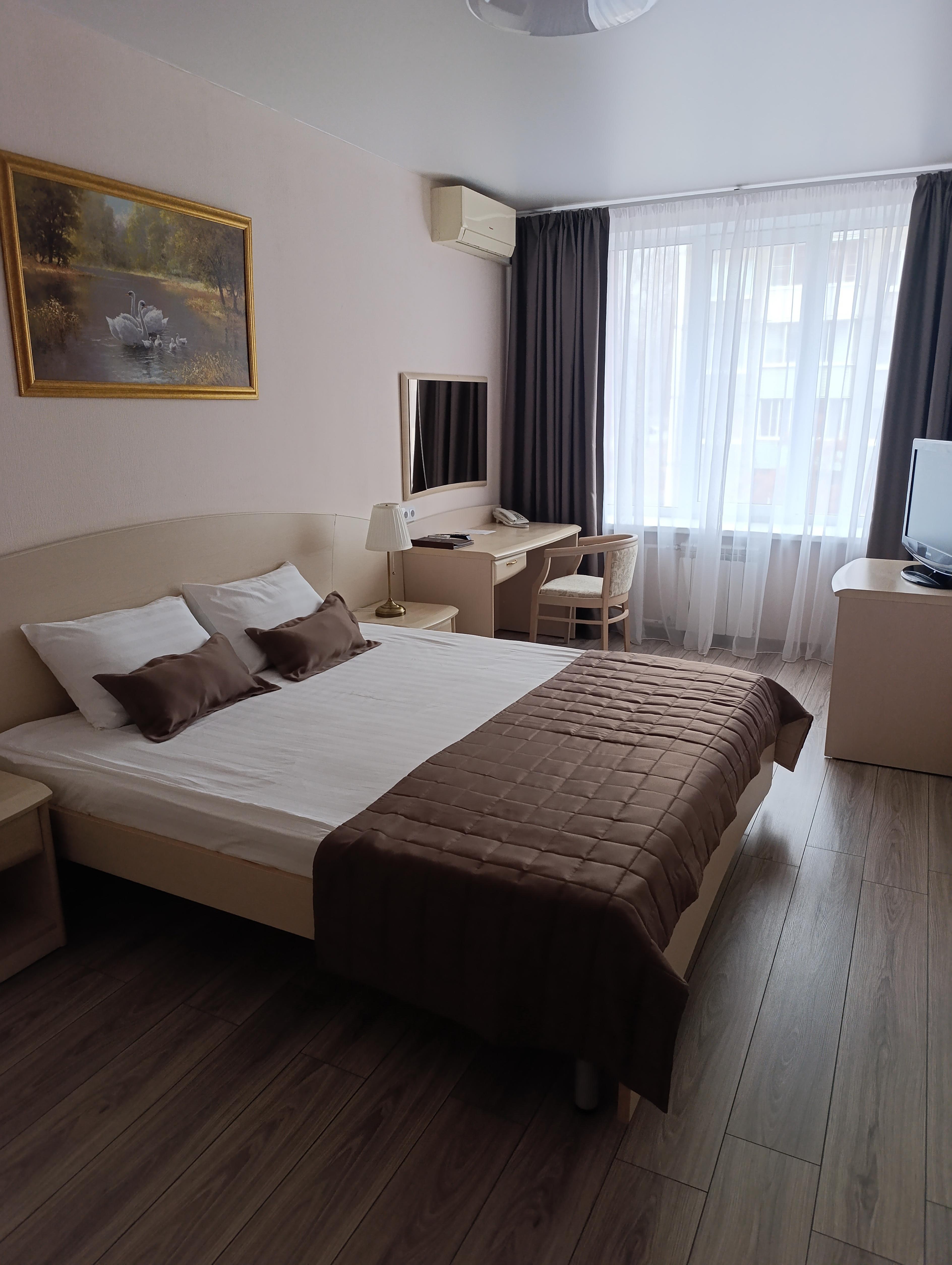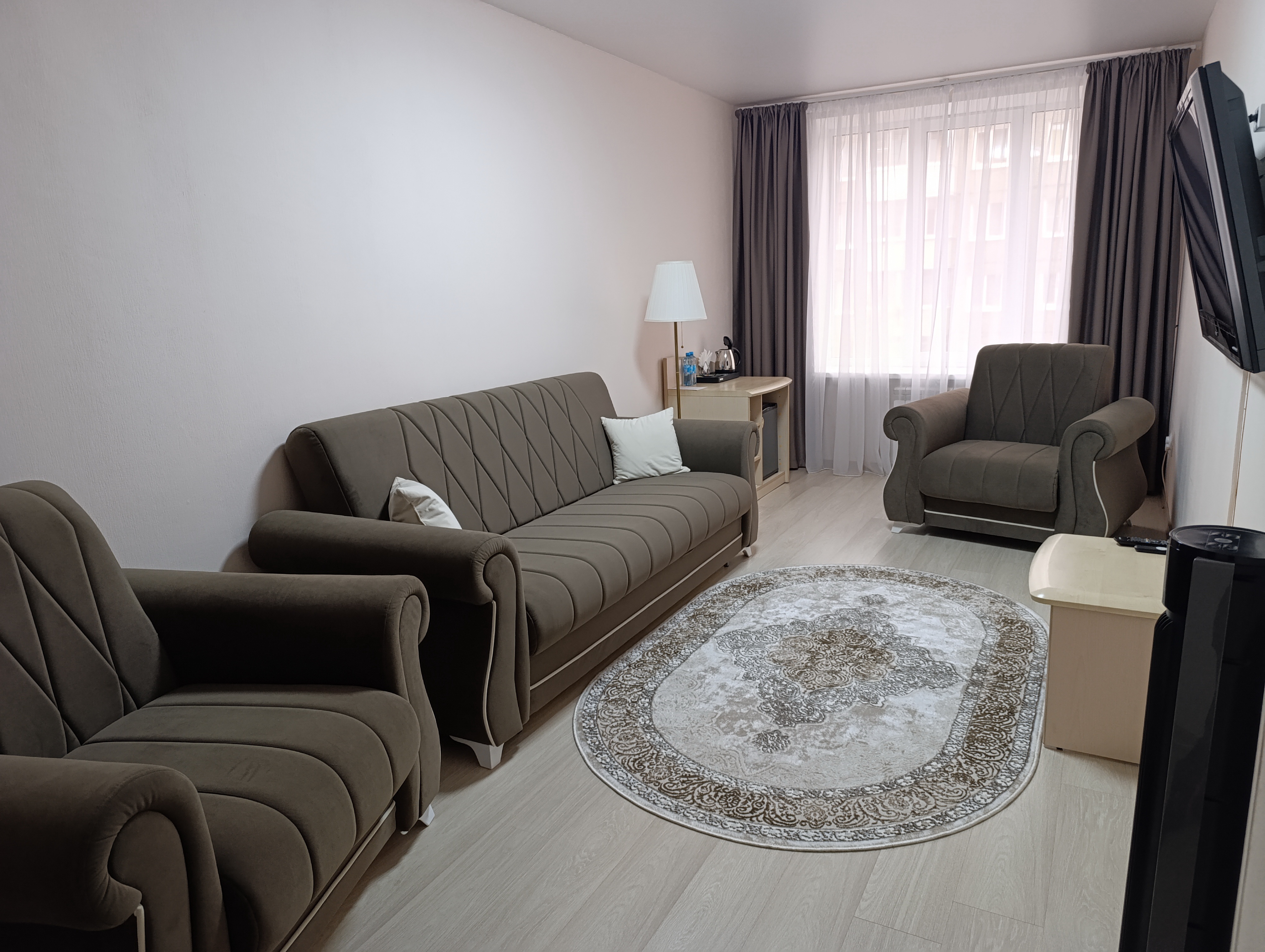 Площадь номера составляет 40 – 48 кв.м. В двухкомнатном номере – гостиная, спальня, ванная комната и прихожая. Обновленный интерьер создает уют и комфорт для проживания постояльцев, предоставляя всё необходимое для отдыха и деловых поездок.